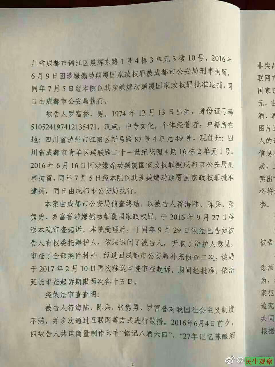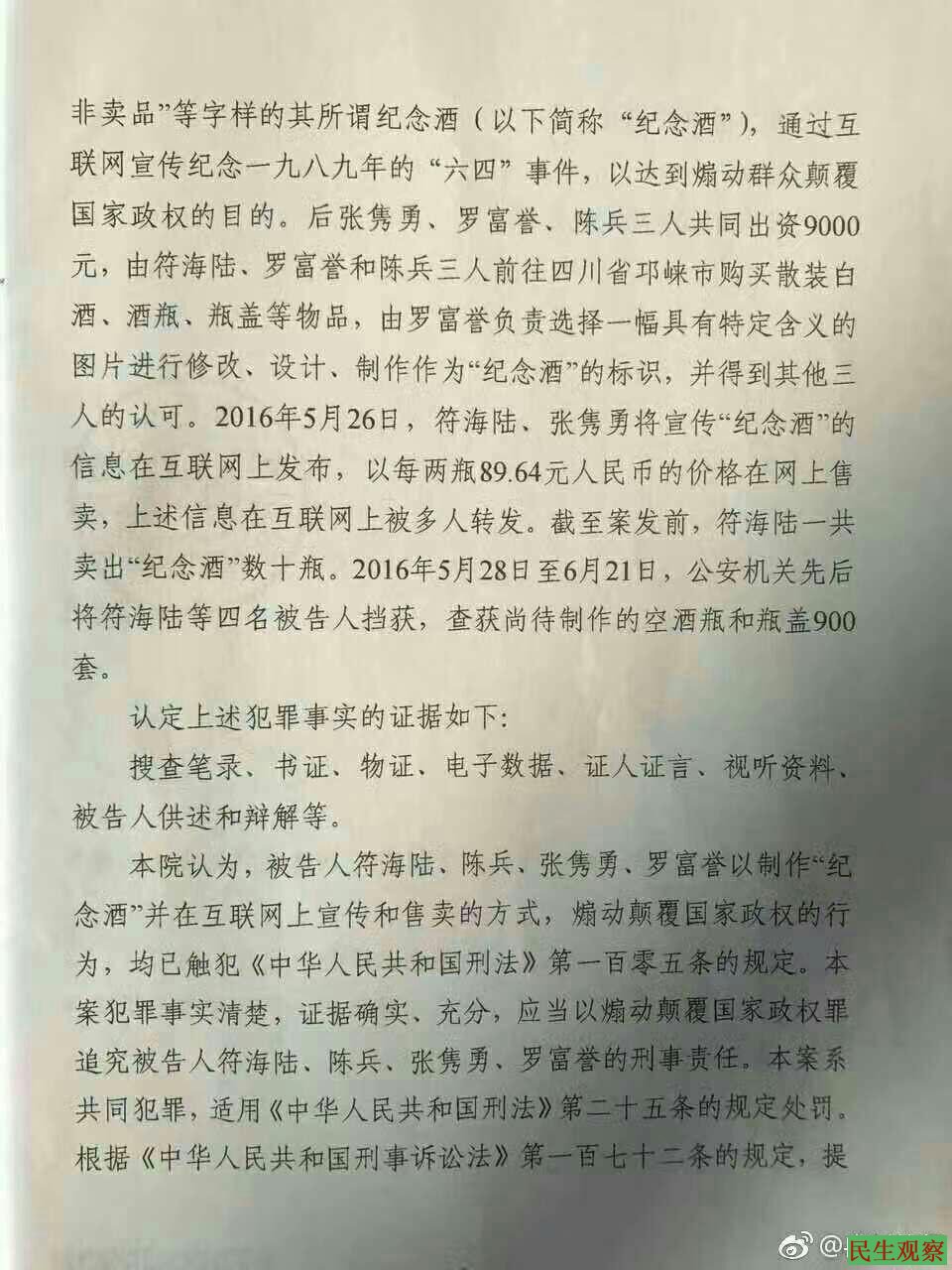 因涉及六四酒案符海陆等四人被以涉嫌煽颠罪批准逮捕_民生观察 关注底层民众命运