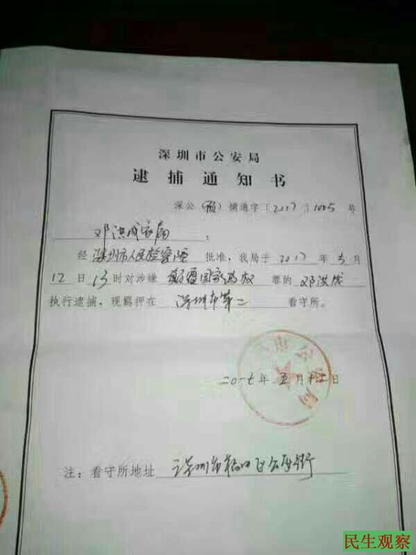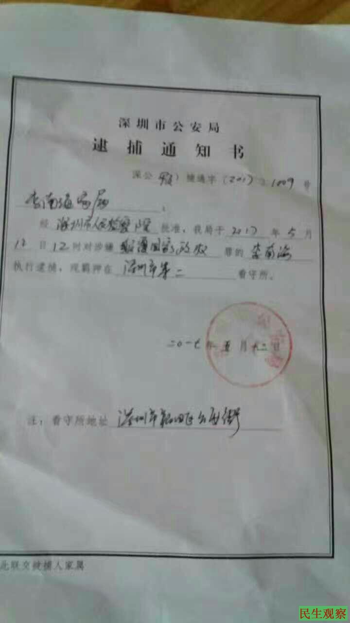 【民生观察工作室2017年5月21日消息】本网获悉,深圳大抓捕之邓洪成、李江鹏以及李南海已正式被深圳市检察院批准逮捕,罪名为“颠覆国家政权罪” , 邓洪成、李江鹏以及李南海的家属最近分别收到深圳市公安局寄来的逮捕通知书,三人目前羁押于深圳市第二看守所。