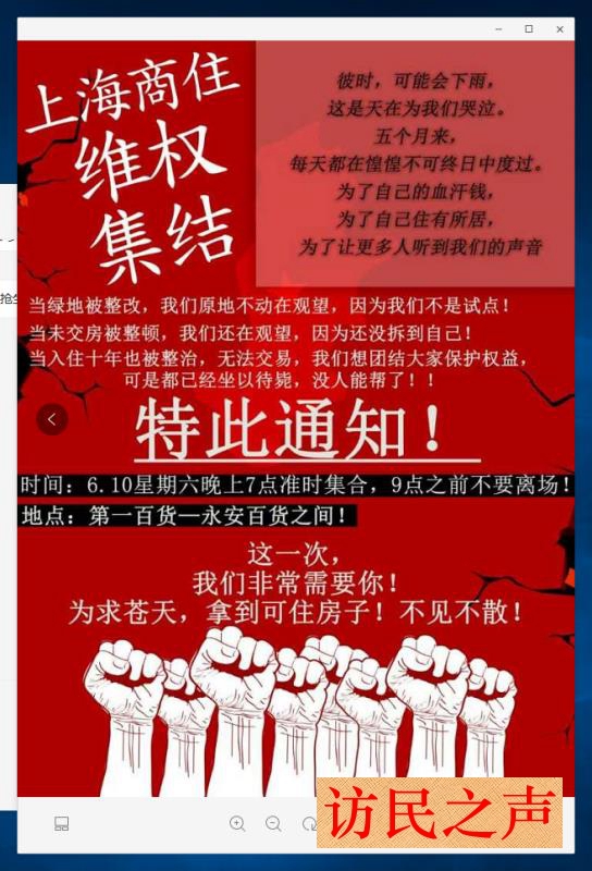 [访民之声2017/6/11消息] 昨晚,在上海的南京路步行街,大批居民高喊着口号进行游行示威,抗议上海政府商住两用政策一刀切,让购房者的钱打了水漂。官方为此出动大批警力镇压,多名游行人员被带走。