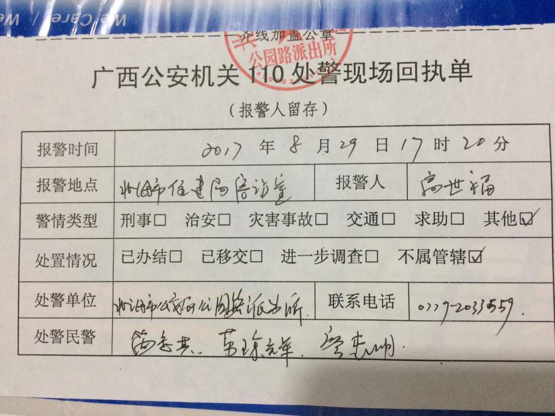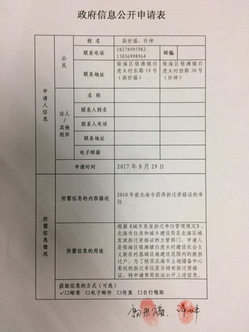高世福告诉本网,昨日,其与许坤等人前去北海住建局递交信息公开申请以及举报函,信访部门工作人员和住建局办公室人员态度冷淡不理不睬,对于递交的材料拒不出示收函回执,交涉时以各种理由推托拒绝,迫于无奈,高世福报警求助,但110民警在了解事情后以此事不属于警方管辖为由,要求双方协商解决。最后,在住建局信访部门不愿出具收函回执的情况下,高世福等人只好将信息公开申请以及举报函留置在住建局信访办。