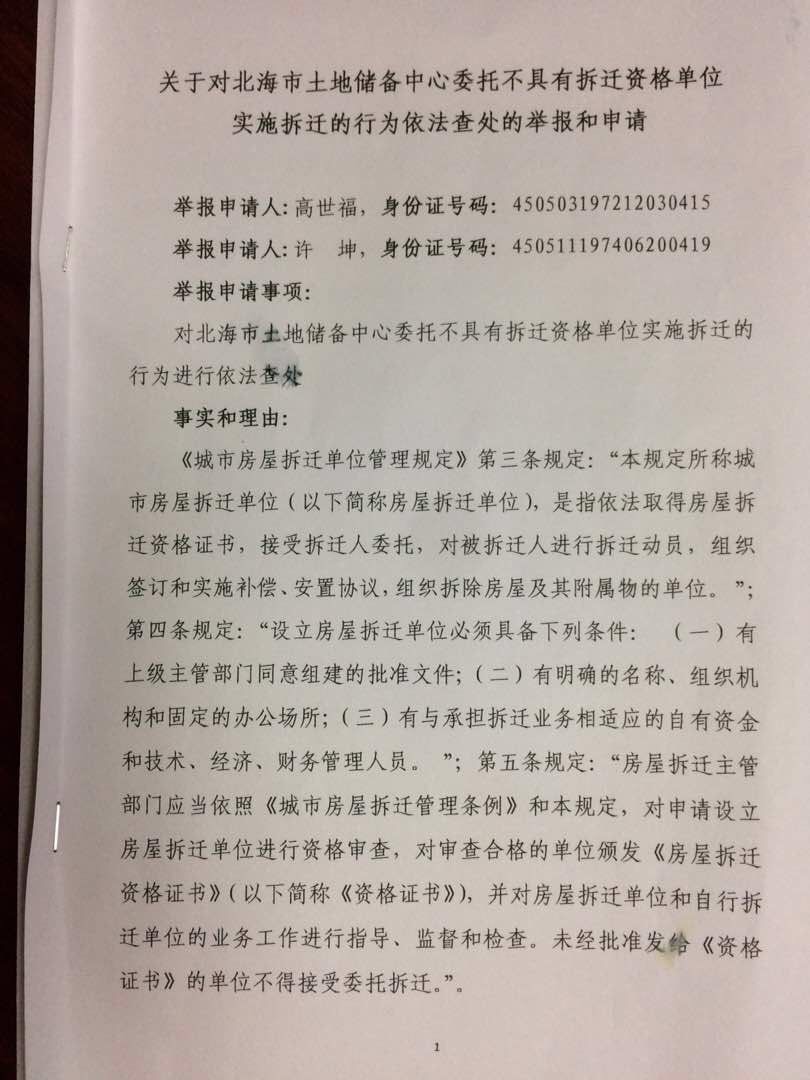 举报申请事项:对北海市土地储备中心委托不具有拆迁资格单位实施拆迁的行为进行依法查处