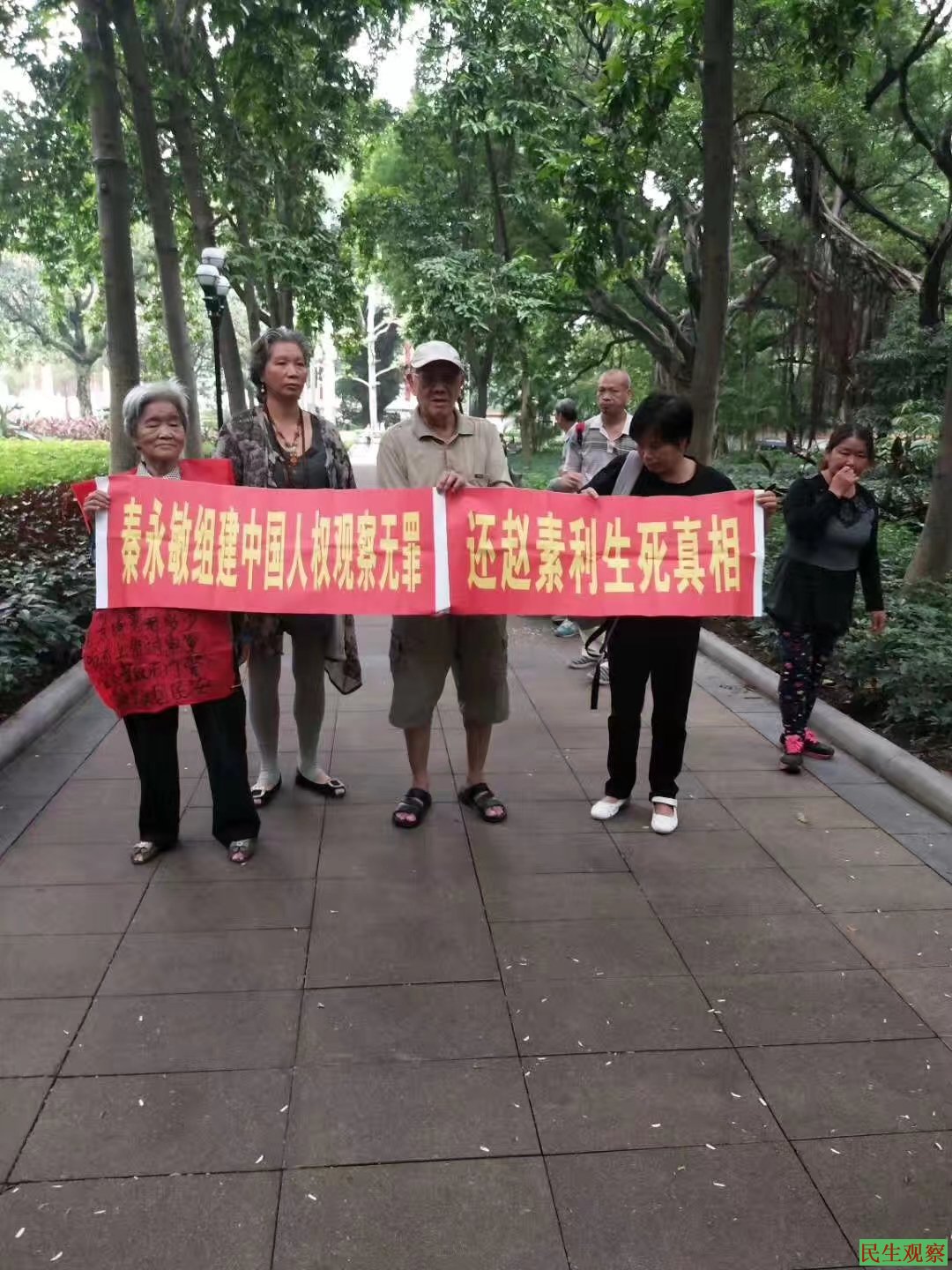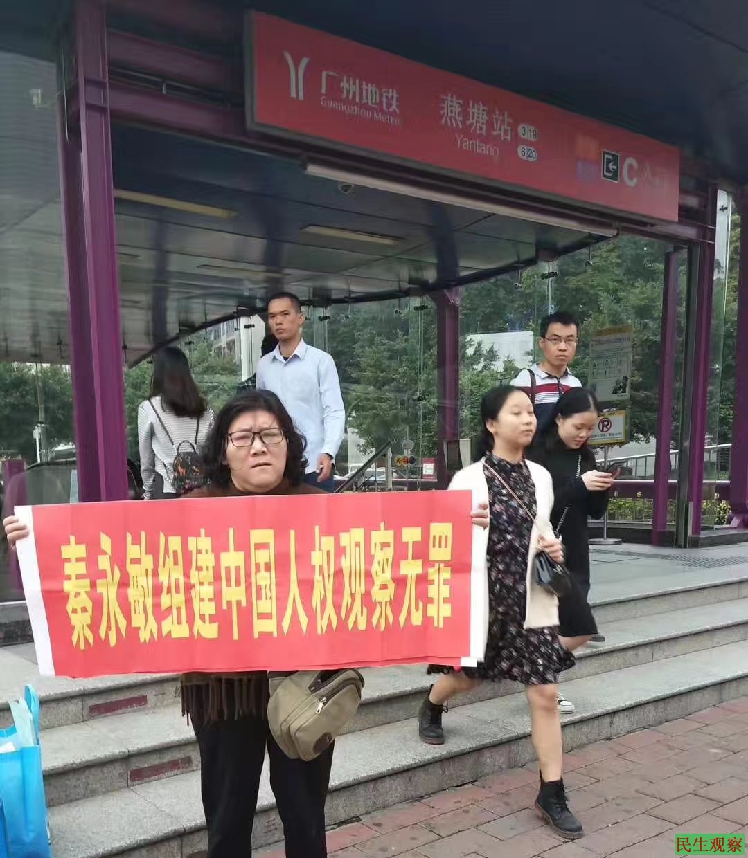 【民生观察2017年12月3日消息】今天下午,本网观察员从江苏维权人士徐秦处获悉,今天她被广州国保警察强制驱赶遣返回了江苏原籍,事情起因或与她近日抵达广州后,多次与维权人士在广州街头举牌有关。前日,她因受广州维权朋友们相邀来到了广州,到达后,她与朋友们多次在广州地铁站、公园等处举牌维权,其中包括为资深异见人士秦永民奔走呼吁,他们举牌的内容有“秦永敏组建中国人权观察无罪”、“还赵素利(秦永敏妻子)生死真相”等。昨天,她就被广州的国保警察抓住,经多番调查其并无违法犯罪行为后,就联系了江苏国保要求强制遣返她回江苏原籍。