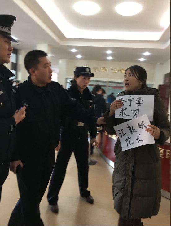 2018年1月11日,李宁与小姨再次来到了山东省委省政府,想向省委、政府反映政府律师的阅卷权未得到保障的情况,但是接待人员却说相关工作人员今天不上班。于是,李宁就和小姨站在省委门前商议下一步该怎么办,可是在站了约10分钟之时,突然从省委周围冲出来四五十个彪形大汉,将她们团团包围,之后又把她们的手机和皮箱强行抢走并打开检查。随后,这些人把李宁和小姨强制带至派出所审讯。派出所警察以她们涉嫌”扰乱公共秩序“为由,连夜突审一夜。最后,李宁的小姨因寒冷与劳累而突发疾病被送往医院救治。