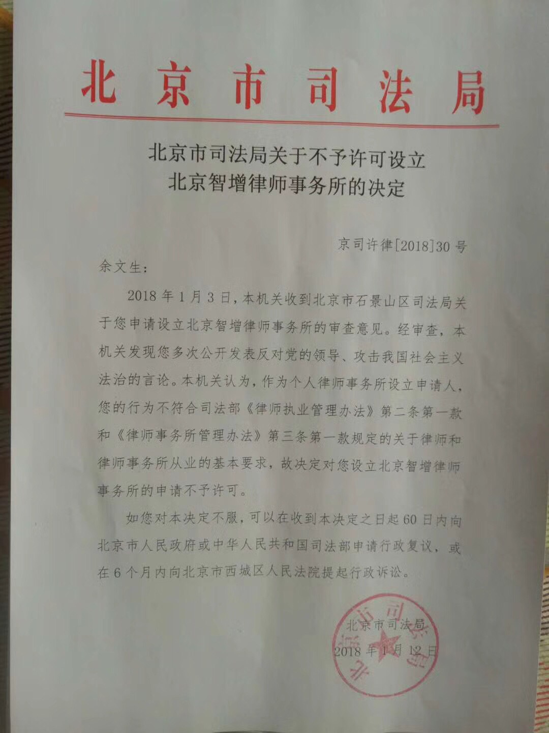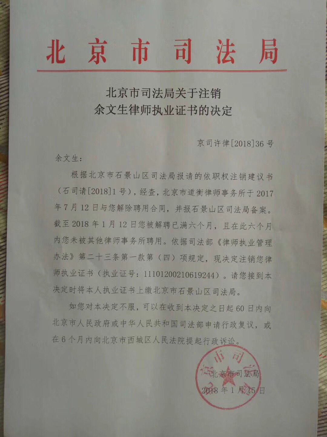 【民生观察2018年1月15日消息】本网获悉,今天,北京知名律师余文生同时收到北京市司法局发出的《北京市司法局关于注销余文生律师执业证书的决定》以及《北京市司法局关于不予许可设立北京智增律师事务所的决定》的书面函,表明余文生律师的律师执业证书已被北京市司法局正式注销。