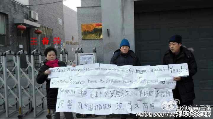 据了解,王春荣是北京市朝阳区三间房乡白家楼村的农民,因为征地拆迁北京三间房乡政府在没有任何手续的情况下,就把她家的房屋给强拆了,而乡政府给她安置的房子是却是违法建设的,几年下来都办不了房产证,王春荣发现之后就举报到了北京市国土资源局。至此,王春荣就成了乡政府的稳控对象,每到敏感时期,她都会被乡政府派出的维稳人员非法拘禁起来,期间也时有维稳人员暴力殴打王春荣。2017年3月两会期间,三间房乡政府找了七、八个外地人(黑保安)来拘禁王春荣,不让她去北京市国土资源局反映情况,之后王春荣瞅准机会溜出来,正准备要上公共汽车时,却被这群黑保安从汽车上连拖带打的拽了下来,并且将她重重的摔倒在地上,她的头部都因此被撞伤。被殴打后,王春荣躺在地上起不来,好半天才从身上摸出手机报警,可警察来了之后也只是简单的问了问情况,而后就敷衍了事的不予侦办,过后这些黑保安也一直不给王春荣看病。在多年的上访维权中,王春荣吃尽苦头,多次被地方维稳部门非法绑架、拘禁、殴打、拘留。