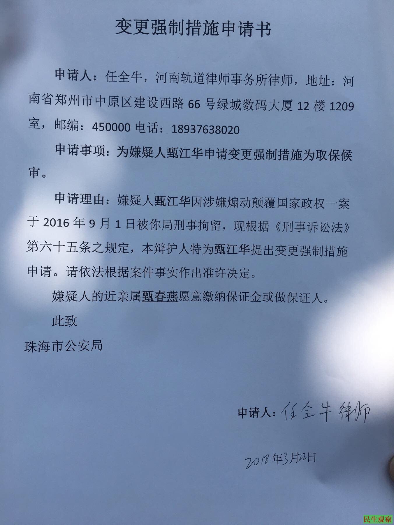 【民生观察2018年3月23日消息】本网获悉,日前,甄江华案辩护人任全牛律师继续向珠海当局要求会见已被羁押逾半年的珠海人权捍卫者八零后青年甄江华以及要求警方向律师介绍案情等要求,但均遭到否决。