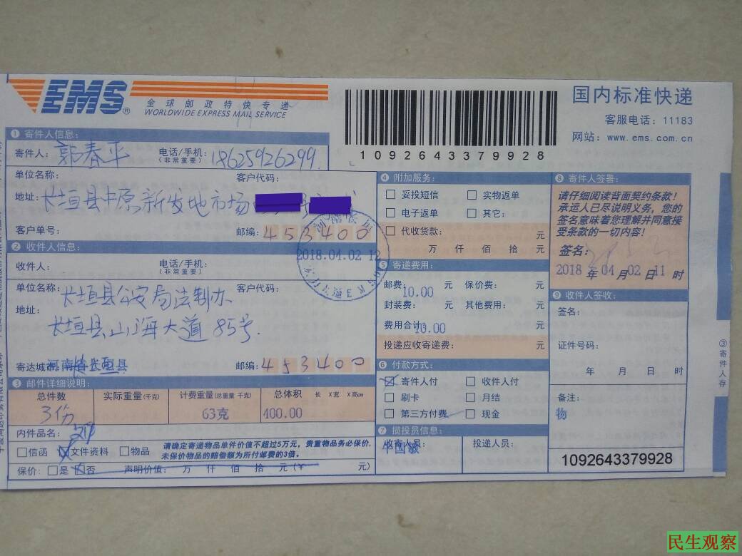 继上次报警一周后的今天(4月2日)中午,河南维权人士郭春平就上个月(3月27日)被长垣县国保队长陈雪、牛姓教导员无端殴打,报案后常村派出所王警官不依法给报案人“案件受理回执”的事情,向长垣县公安局快递邮寄了两份信息公开表。随后,郭春平再次拨打电话联系长垣县110,反映3月27日被国保殴打的遭遇及索要“案件受理回执”。110警察说他们只管当天的报警,受理回执还得找常村派出所。