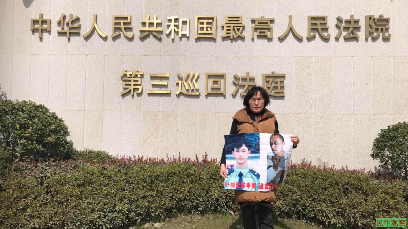 但叶桂香表示,每次提交申诉材料,官员都以各种借口推诿责任。2017年8月叶桂香又一次向南京第三巡回法庭递交了儿子叶剑被蒙冤坐牢的书面证据材料,当时接待法官收下材料后要叶桂香三个月之后等结果。三个月后法官却告知申诉的材料不全。无奈叶桂香再次按法官要求把所有的材料包括新补充的证据全部递交,又等了四个月,可盼来的结果还是一样。