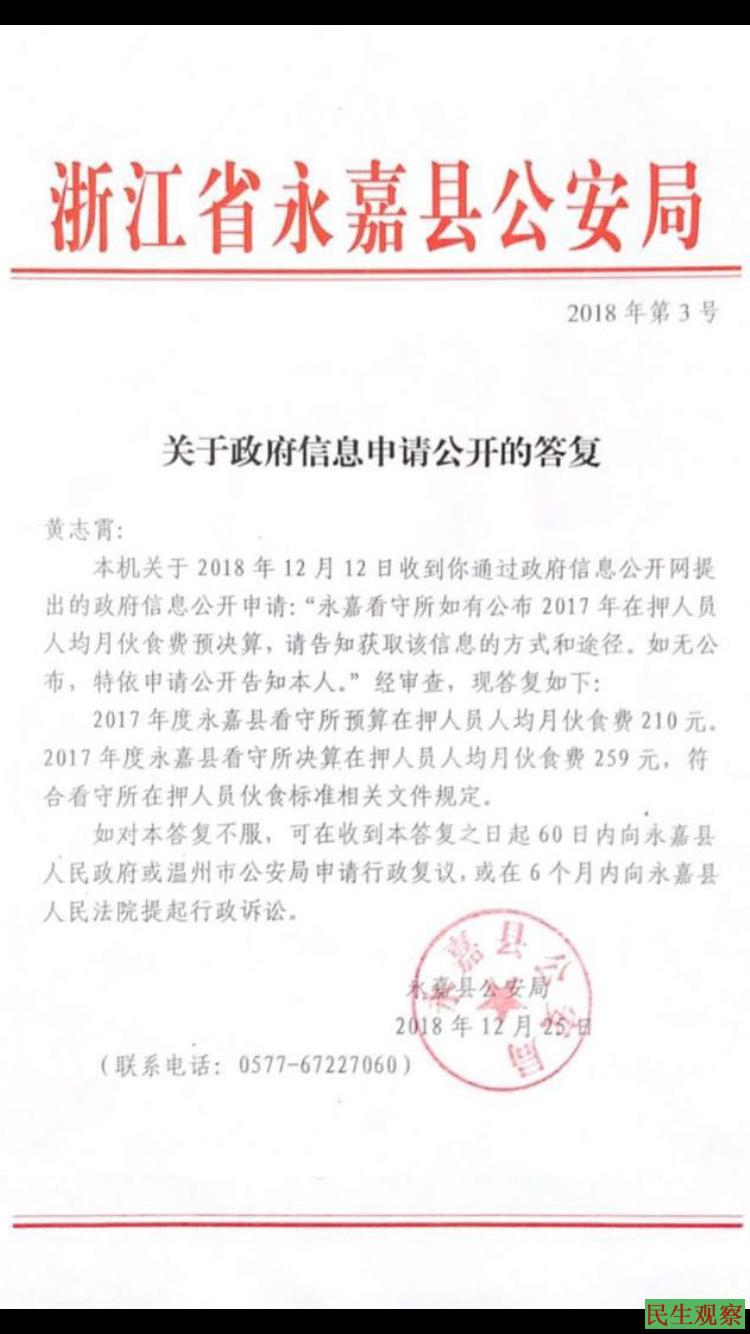 黄志霄获释后,于2018年12月12日,通过永嘉公务网向永嘉县公安局申请政府信息公开。该局在25日答复称“2017年度永嘉县看守所决算在押人员人均月伙食费259元”。