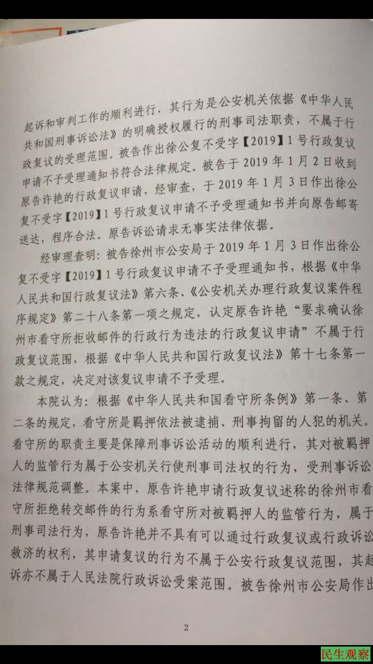 不过在案件没有开庭的情况下,许艳女士却在4月18日收到徐州市铁路运输法院于4月15日作出的行政裁定书,判决驳回了许艳的诉讼请求。徐州市铁路运输法院审议认为,徐州市公安局不予受理许艳提出行政复议申请并无违规和违法。
