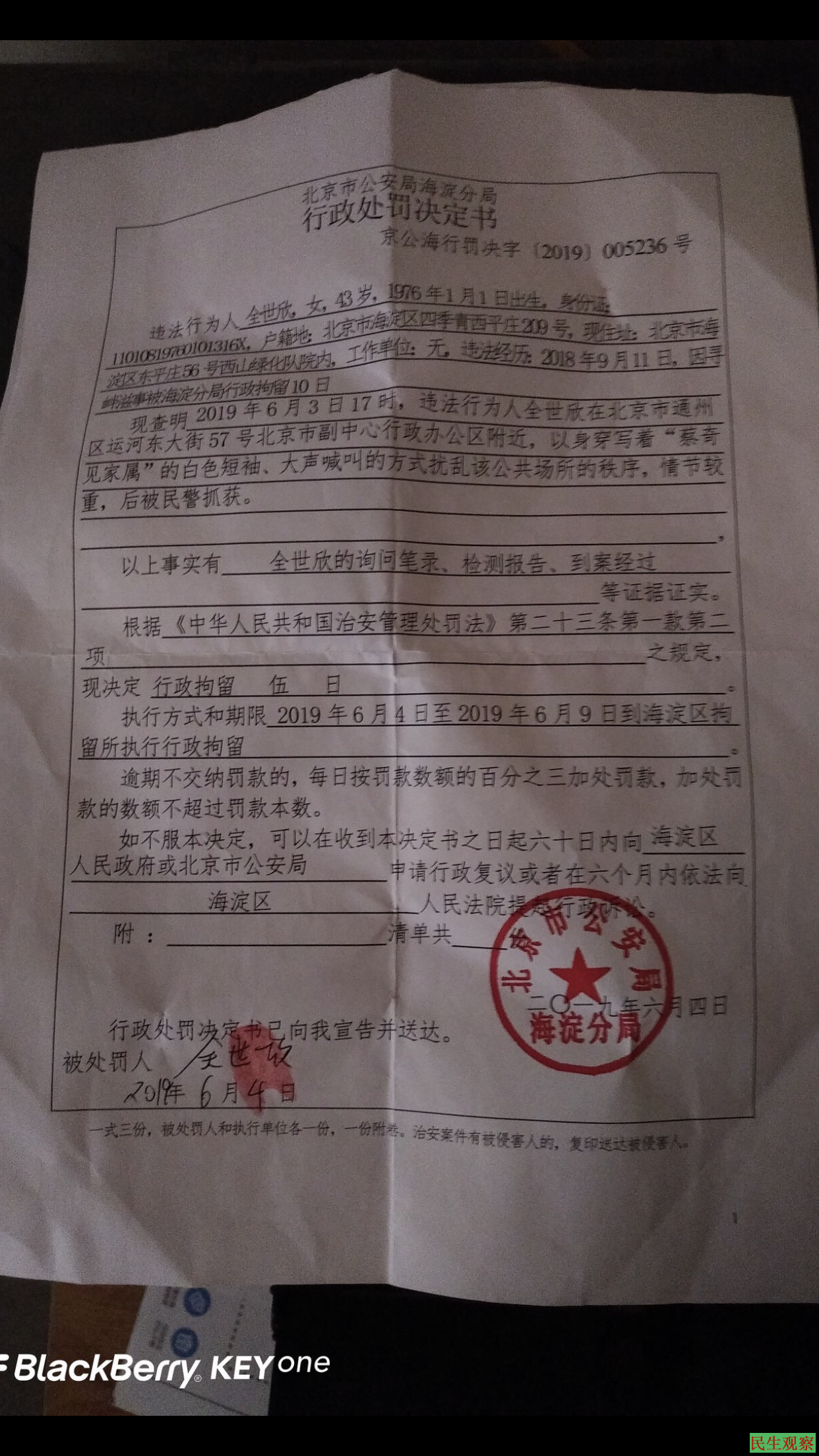 据悉,6月3日下午三点左右,全世欣从海淀住处出发去到位于通州的北京市政府副行政中心反映情况,当时身穿写有“蔡奇见家属”字样的白色短袖T恤,高喊要求与市政府相关负责人见面递交相关材料,寻求解决问题。下午五点,全世欣被通州警方带走,送到通州区运河派出所做笔录。其后,全世欣被海淀警方接回,指其“扰乱公共场所秩序”,行政拘留五日,关押海淀区拘留所,时间从6月4日至6月9日届满。