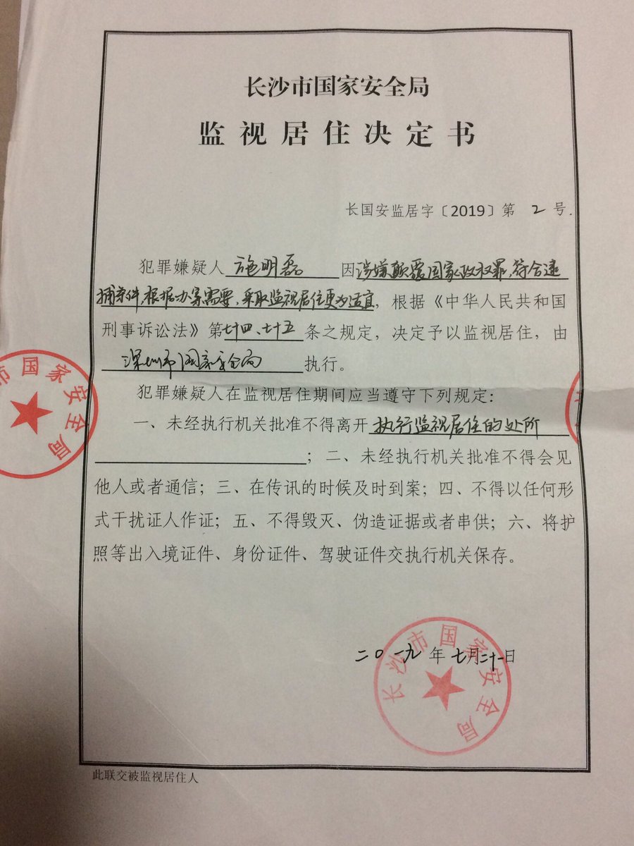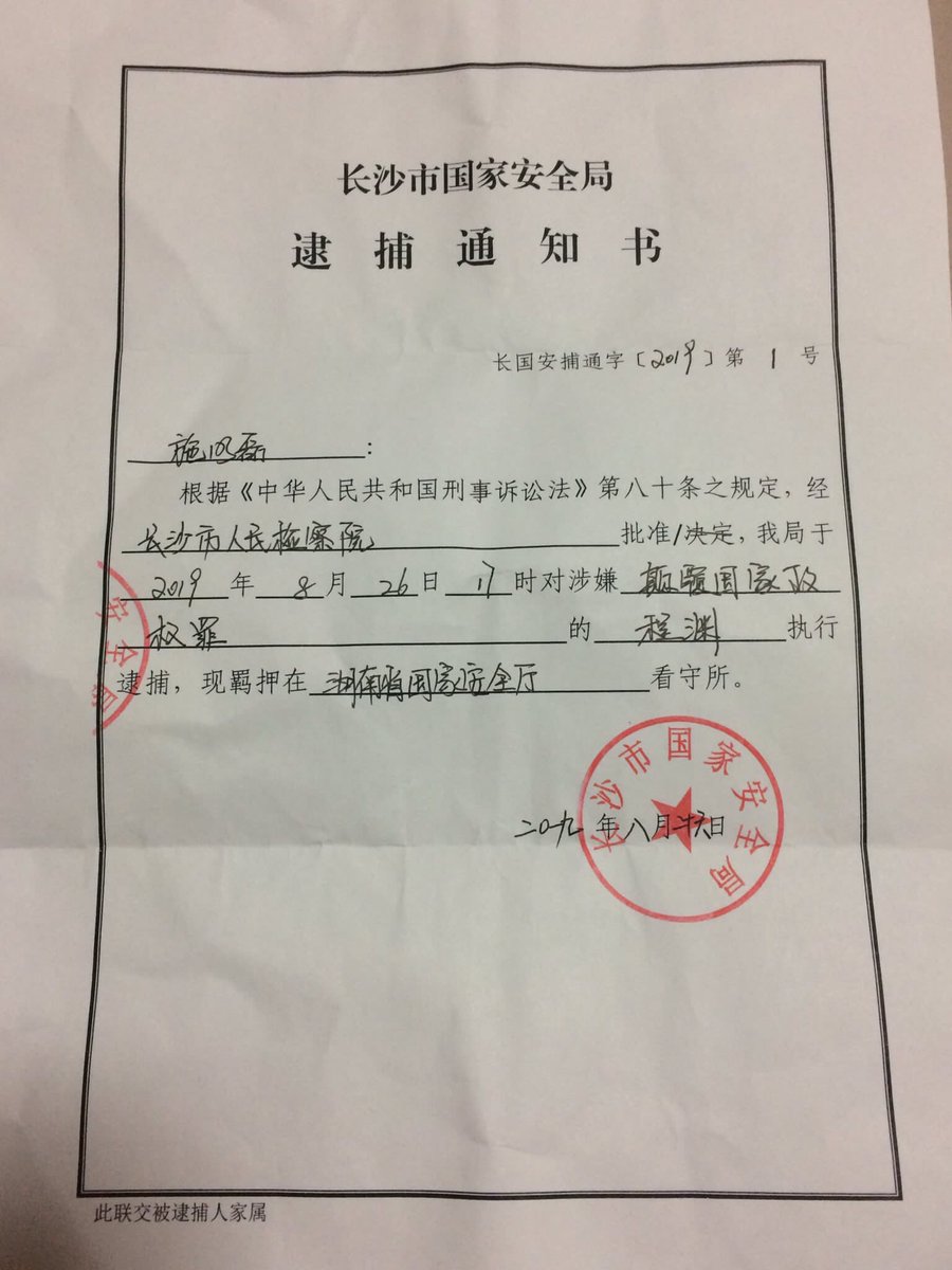 据称,7月22日当日,“长沙富能”机构负责人程渊在家中遭到长沙市国安局拘捕,而长沙国安连带將程妻施明磊“监视居住”,扣押了施的多件个人物品,包括手机、电脑、多个银行卡、社保卡、身份证、护照、港澳通行证等,仅留给施明磊一张只有两万元存款的房贷卡。