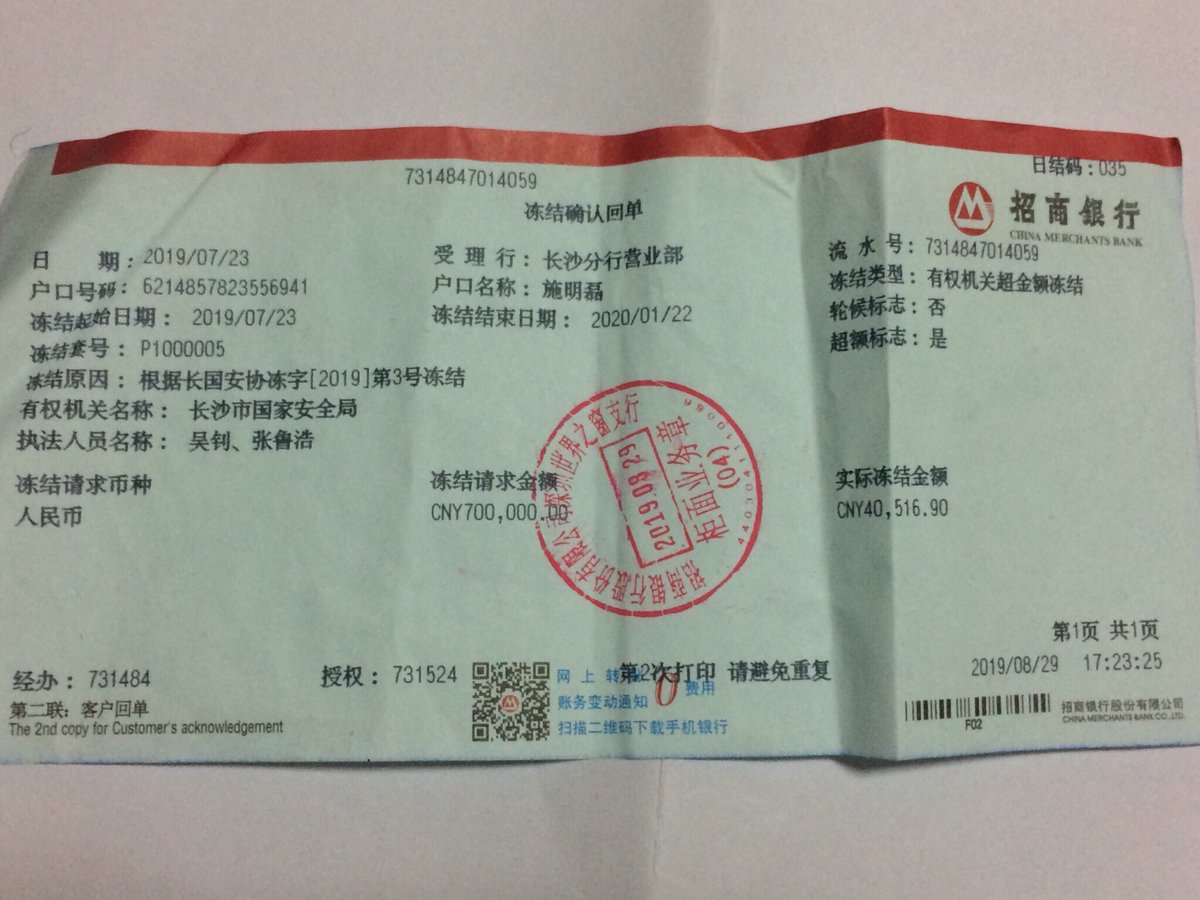 据施明磊透露,程渊被捕后不久才发现自己的银行卡已悉数被冻结,为此施明磊曾向银行查询后得知长沙国安在程渊被捕后翌日(7月23日)将其银行卡冻结。