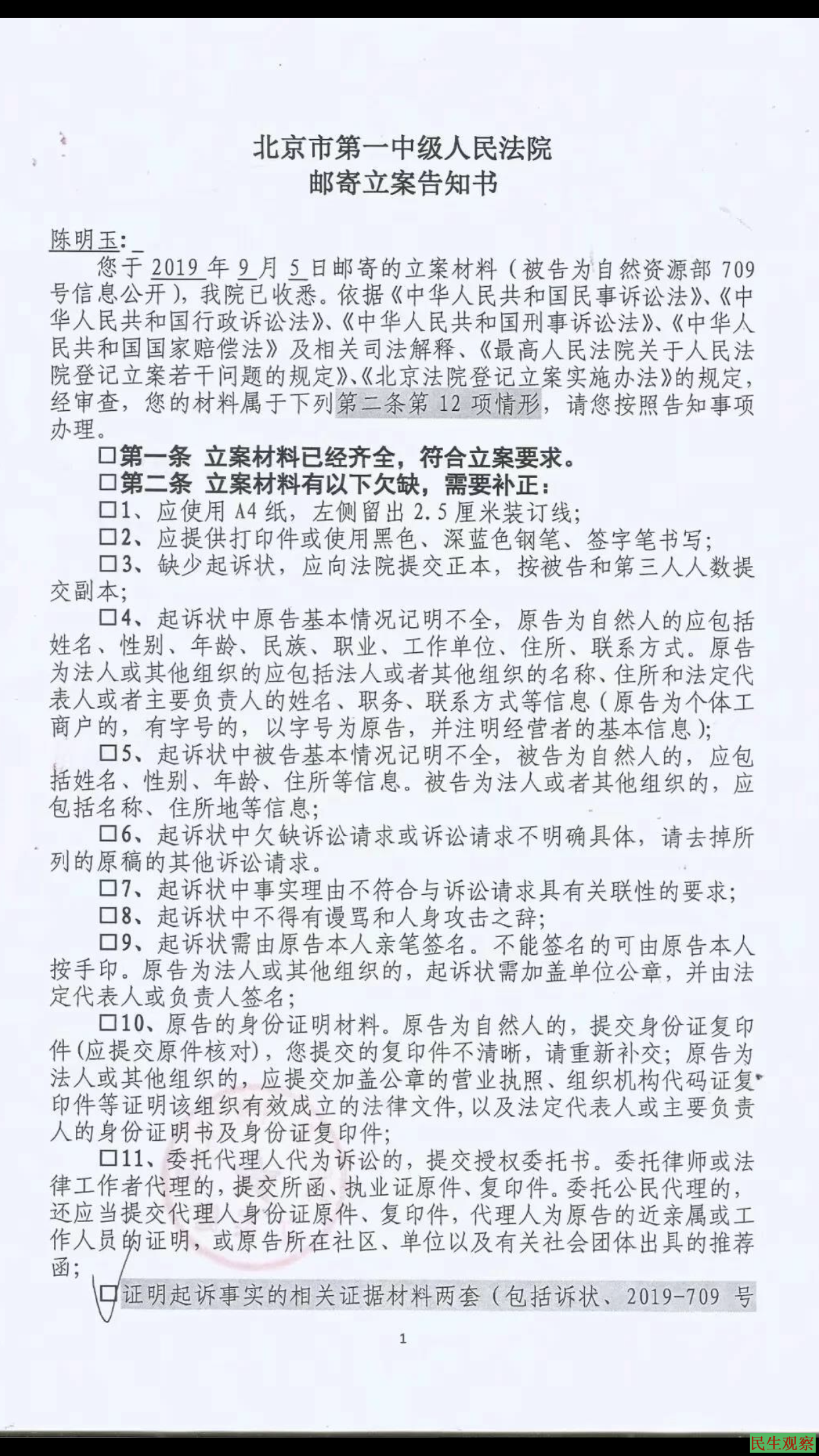 今天下午本网联系上陈明玉,她说,2019年9月5日,她向北京市第一中级人民法院邮寄了立案材料,诉自然资源部709号信息公开一案。9月27日,北京市第一中级人民法院书面给予了答复,称该院已收悉,但立案材料有欠缺,需要补正,要求她在收到书面告知书后,于30日内前往该院办理相关手续,逾期法院则视为撤回起诉。