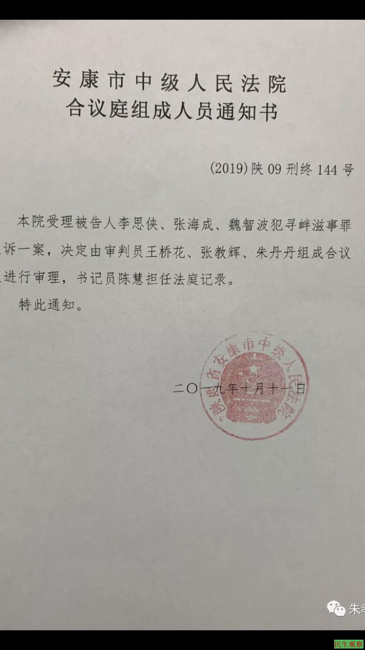 2019年10月10日下午,辩护律师集体赶到安康市中院,千呼万唤才出来的张教辉副庭长当面解释了“合议庭决定”,律师请求张教辉副庭长把合议庭成员告知书送达给他们,也好知道合议庭成员究竟有哪些人员组成。