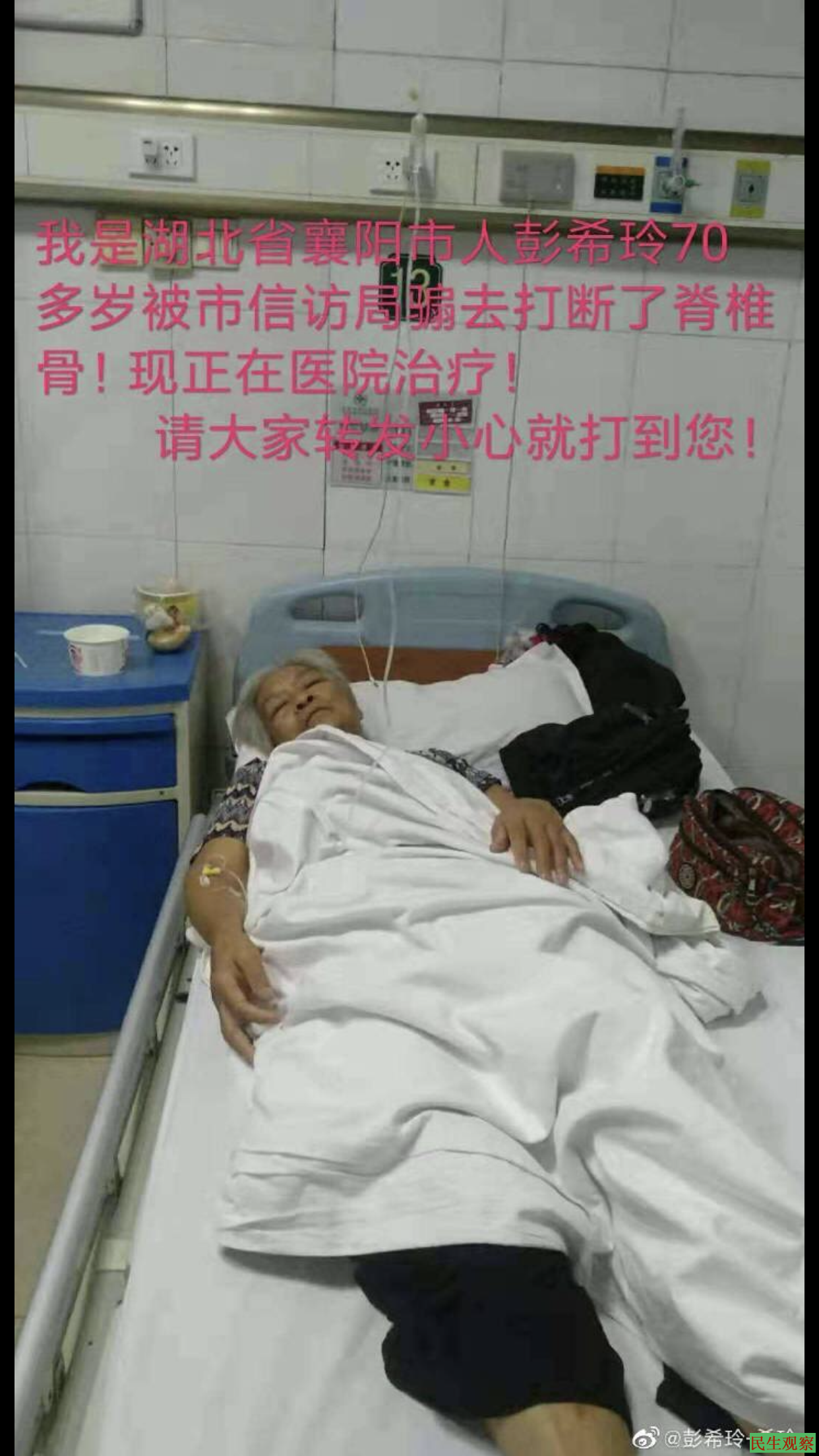 【民生观察2019年12月23日消息】湖北省襄阳市樊城区访民彭希玲,因儿子被故意伤害案遭当地法院枉法判决而上访,期间问题不但没有得到解决,她还因上访,被多次暴打关黑监狱,受尽折磨虐待。