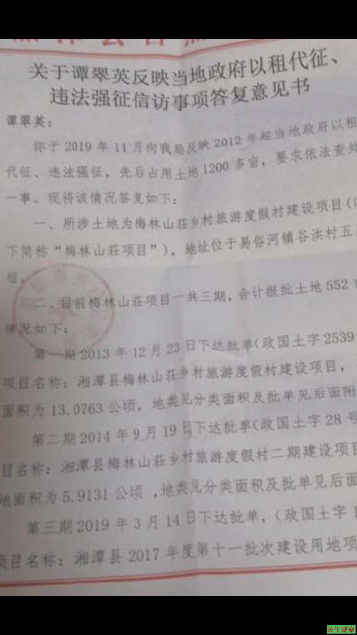 【民生观察2020年2月12日消息】湖南省湘潭县三级政府渎职枉法侵占村民土地1200亩长达7年,当地农民多次联名揭发检举,却遭到地方官员的打击报复,被信访拦截,被非法关押,被以莫须有的罪名行政拘留等。