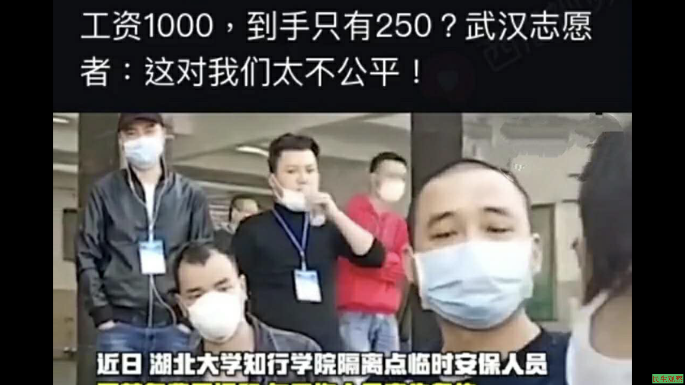 【民生观察2020年3月23日消息】2020年3月20日上午,湖北武汉十余名保安人员来到湖北大学防疫隔离点,集体抗议防疫补助费遭领导侵吞。