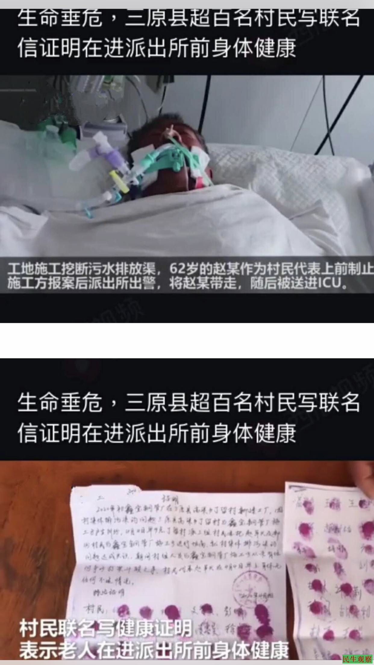 【民生观察2020年4月14日消息】本网获悉,4月4日,在陕西咸阳三原县丁留村,62岁村民赵军兴因与施工方交涉污水排放问题,被到场警方定性为“阻挠施工”,后警察将其抓进辖区派出所审讯,但几个小时候后,赵军兴便因遭受严重外伤而昏迷不醒,后赵军兴被送到医院重症监护急救。