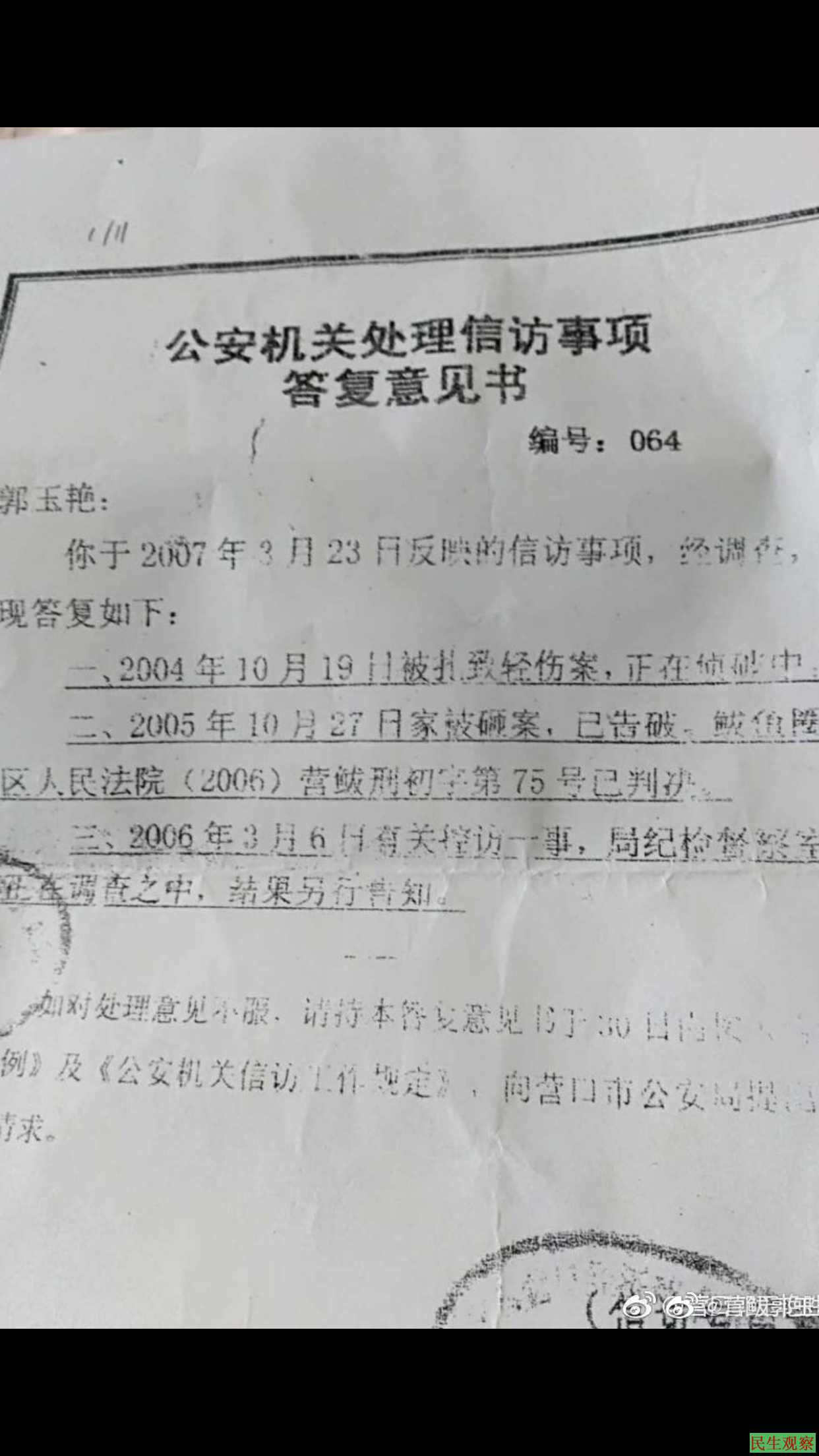 在郭玉艳的多次上访追案下,鲅鱼圈区公安局在2007年3月28日给她出了一份答复意见书。