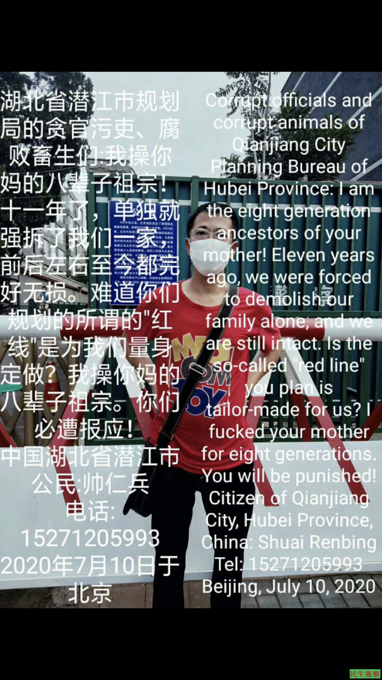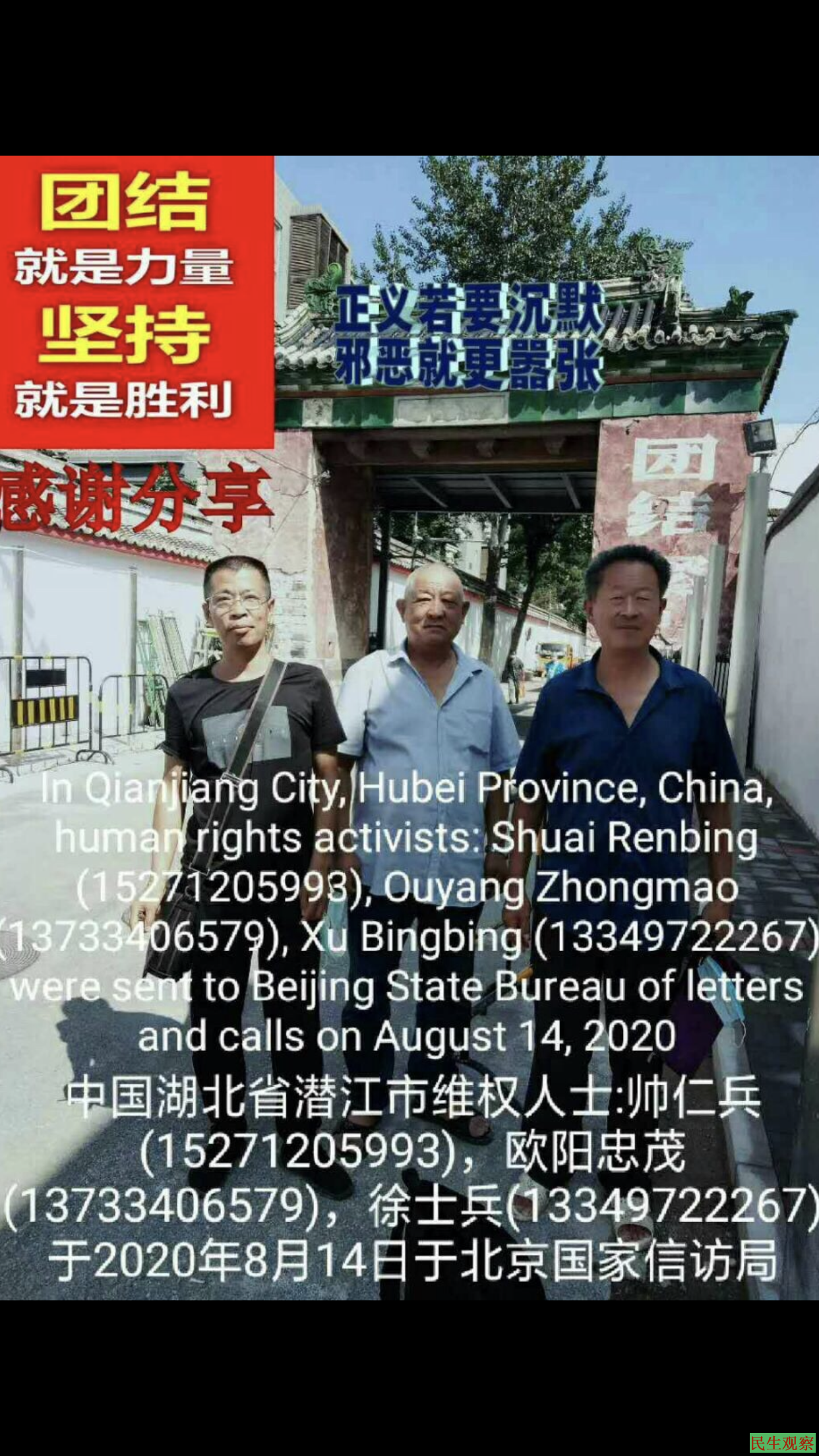 徐士兵是因为坼迁补偿不合理也不合法,一直在北京维权,2020年8月14日在北京国家信访局偶遇欧阳忠茂,帅仁兵三人一起在“三骗胡同”登记信访合影留念。