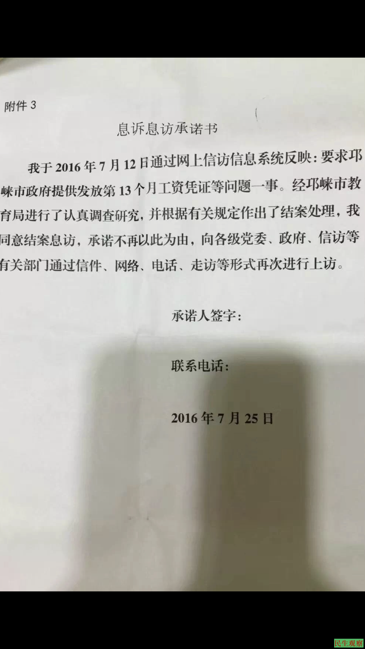 4、欺骗、强迫三十多位向国家信访局投诉的民师签《息访息诉承诺书》。欺骗说签字后就全部解决问题,然而至今四年过去了,民师问题依然没有解决,邛崃民师仍然还在不停地上访中。
