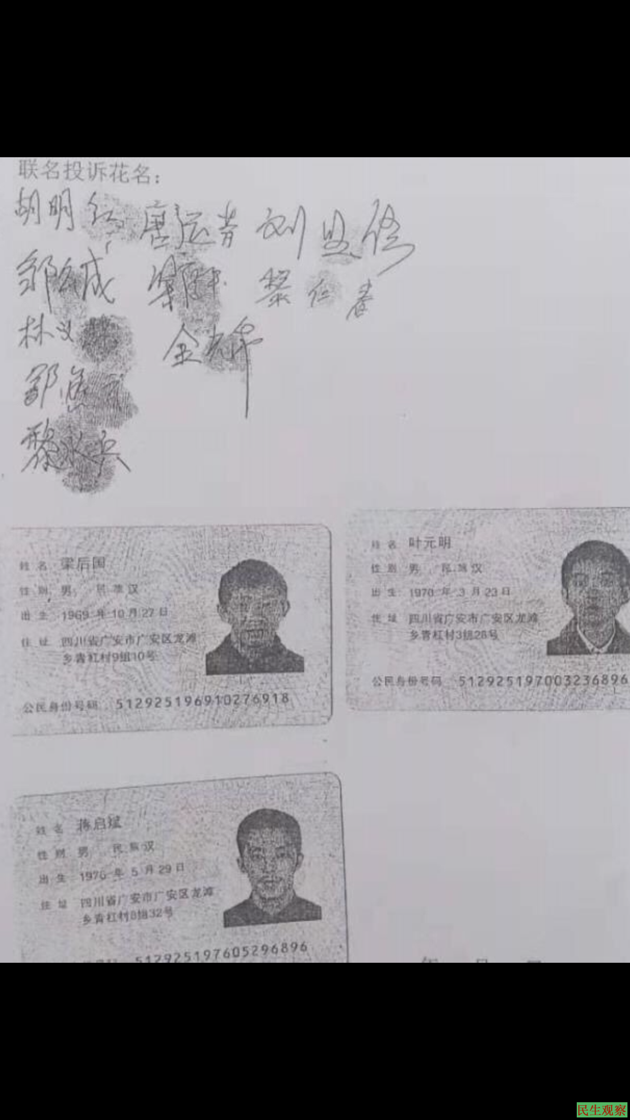 【民生观察2020年12月27日消息】四川省广安市前锋区龙滩镇青杠村叶元明(14708266748)、梁厚国、蒋启斌等村民,是上个世纪70年代出生,留守在村内从事农业生产的农民代表。虽然没有多少见识,也不善吹嘘拍马,但是作为淳朴农民的基本良知,和对社会现象的对错判断,还是保存在自己的生活里。最近,他们义愤填膺忍无可忍,合计之后便联手调查取证和撰写文稿,将龙滩镇党委书记邓让柯、纪委唐世树,还有青杠村原支部书记黎永木、村主任李炳龙,文书叶元合等基层官员,用大量的数据和事实一并检举揭发出来。县镇两级政府早先并不介意,但是没有想到几个村民不依不饶,非要搞到一个水落石出惊动省委的动静。目前,初步的目的已经达到,县纪委、信访办、网信办等机构正着手调查。