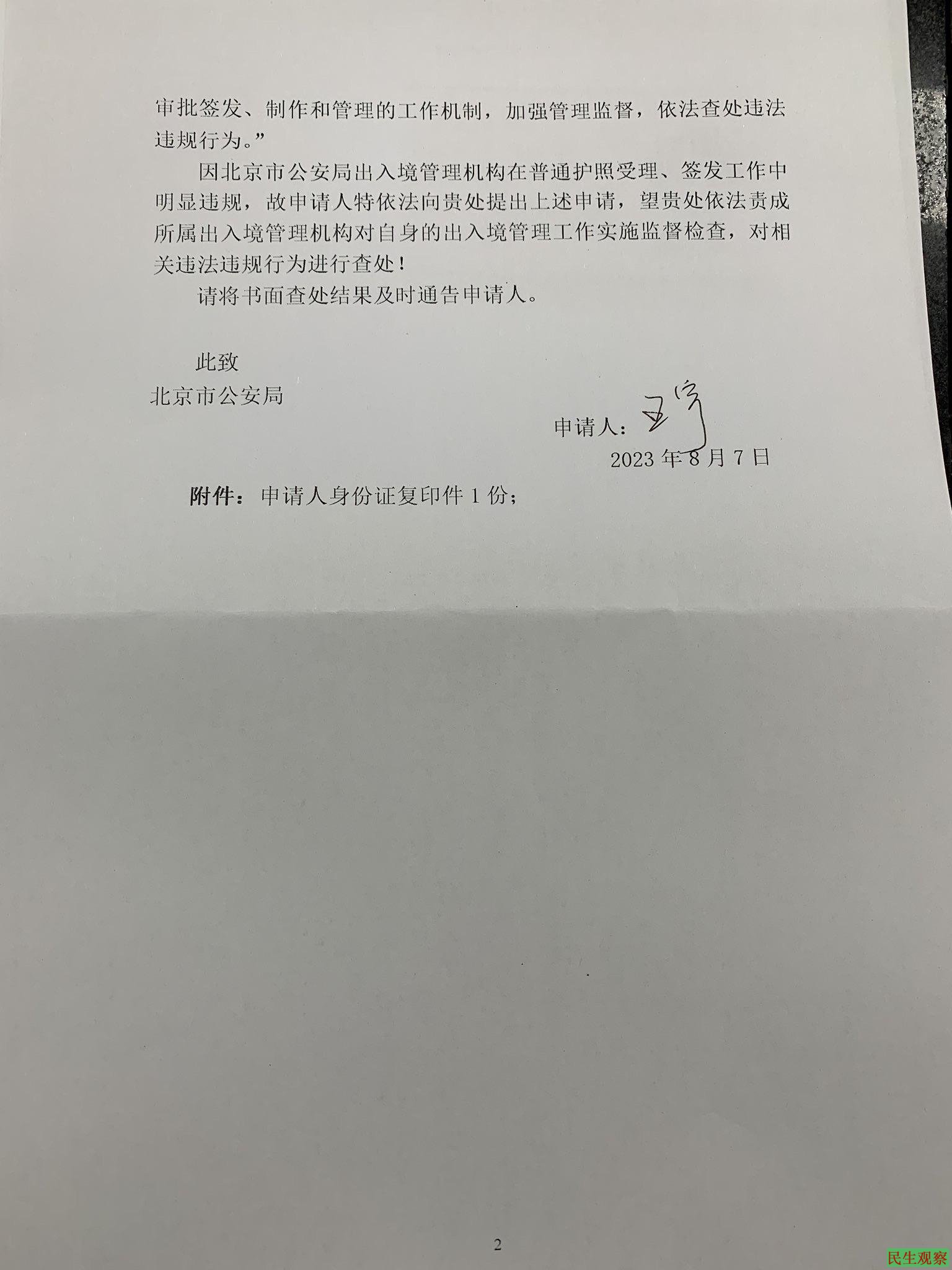 【民生观察2023年8月8日消息】因北京市公安局出入境管理部门及内蒙古自治区兴安盟和乌兰浩特市出入境管理部门,拒绝给王宇办理普通护照,针对此违法行为,王宇向北京市公安局和内蒙古自治区公安厅提起依法履责申请书,并于8月7日邮寄至有管辖权的机关,目前等待法治国家对其依法查处并纠正其违法行为,依法为公民办理护照。