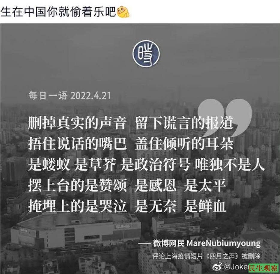 另有一些人按照经验担心在上海解封后,现在响彻天际的“四月之声”终究会被遗忘。推特用户ArimaTepe指出:“《四月之声》不停地转发不停地被删除。让我想起了大概99.999%上海人不记得的2020年也是反复被转发删除的《吹哨子的人》。可以预见的是6月份解封后上海人马上骄傲地从胜利走向胜利了,好像从未发生过灾难一样。可见这个民族一点反思和记忆都没有,可以被肆意修改的。”