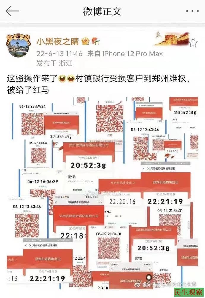 今年4月中下旬开始,河南省包括禹州新民生村镇银行、上蔡惠民村镇银行、柘城黄淮村镇银行、开封新东方村镇银行等多家村镇银行关闭提款服务,据公开报导,该案件涉及金额达三百九十七亿元人民币,有四十万储户的存款取不出来,引发储户维权潮。日前,这些涉事银行的各地储户反映,虽然来自低风险,但去之前也老老实实做了核酸,他们在抵达河南后,健康码一律变红,,导致他们行动困难,抗议活动也被迫取消。中共监管部门的人还直接明示:只要你回家,健康码就能变绿。还有远在千里之外的储户,没去河南,也被河南直接赋了红码,所谓“人在家中坐,红码从天降。”