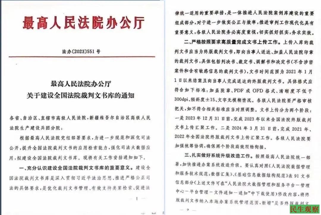 12月11日,社交媒体上传出一份《关于建设全国法院裁判文书库的通知》。该《通知》由中共最高法院办公厅2023年11月21日下发至各高级法院。官媒财新证实《通知》内容属实,并报导说财新从北京、江苏等省份不同层级法院的人士获悉,自2022年底以来,最高法院相关负责人已在多个内部会议上表示要建设“对内使用的案例库”,“把以前传到外网的文书统一传到内网”。据《通知》,“裁判文书库”拟于2024年1月上线运行,仅支持“全国法院干警在四级法院专网查询检索裁判文书”,律师、法学研究者以及更广泛的社会公众无法查阅,并称此新政策是为“深入贯彻习近平法治思想、推进严格公正司法的具体要求”。