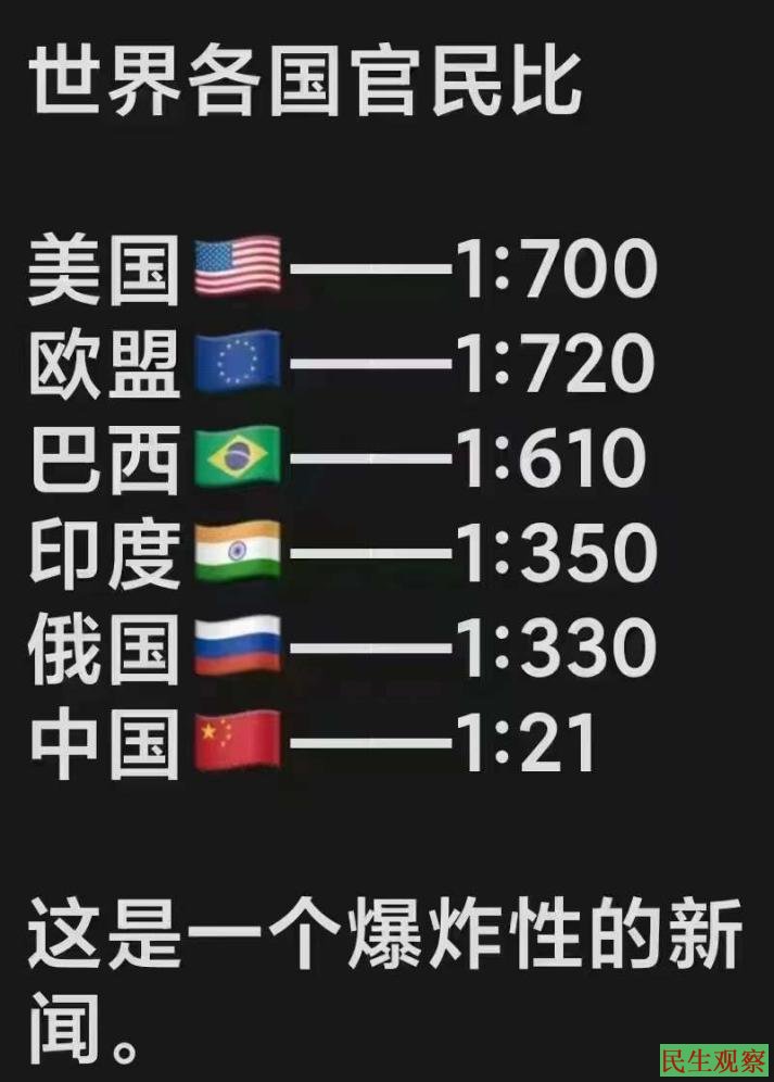 (编者按:连日来网络又热传起一些国家官民比例的截图,其中中国大陆官民比例为1比21,格外刺目,而事实上有研究显示中国官民比更达到1比10的令人震惊程度。中国举世独大的官僚队伍,在国民低工资、低福利与高税收的滋养下还在不断膨胀。这种官僚队伍庞大显然是极权政体的必然景观,而要想改变这种现实,唯有落实公民民主监督权利,让公民决定财政支出,进而决定官僚人数。)