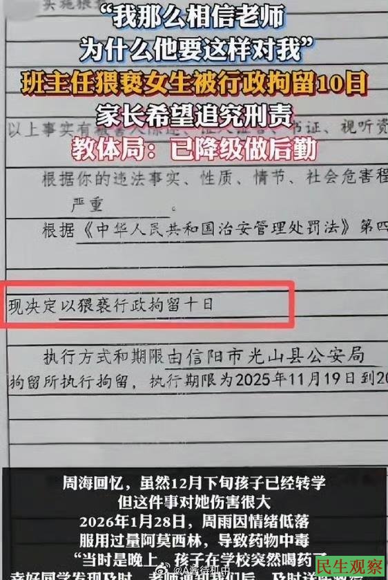 2025年11月7日,河南光山县一名54岁高中班主任被曝将15岁女学生诱骗至宾馆猥亵,仅被行拘10天,家属申请刑事立案被拒,教育局回应对涉事教师刘某作出降级处分。舆情发酵后,光山县公安局于2026年4月15日重组专案组核查;次日通报对刘某刑事拘留,教体局同步开除其公职并撤销教师资格。引发公众对司法定性、处罚力度及师德红线执行力的三重质疑,其核心争议在于警方认定“无强制手段”及教育部门违规将其调岗留校。事件暴露校园监管漏洞,教师行为审查机制亟待完善,公众呼吁更高透明度和对未成年人的保护力度。本案折射出未成年人保护网的深层漏洞:施害代价过低,司法救济失灵,师德红线虚设。成为检验未成年人保护制度刚性的试金石。