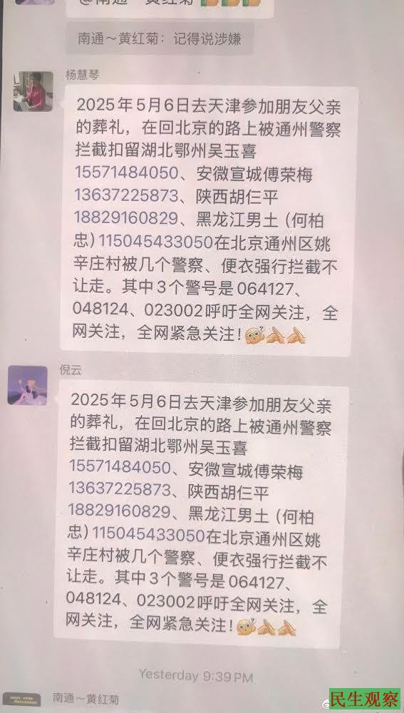 吴玉喜、傅荣梅、胡仁平、何柏忠等4人结伴去天津参加了朋友父亲的葬礼,在返回北京的路上,于2025年5月6日在北京通州区走路时,被通州区张家湾派出所多名干警以查身份证为由违法拦截。
